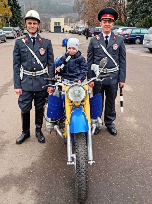 Мальчик сфотографировался на раритетном мотоцикле с жезлом в руках и в окружении «советской милиции».