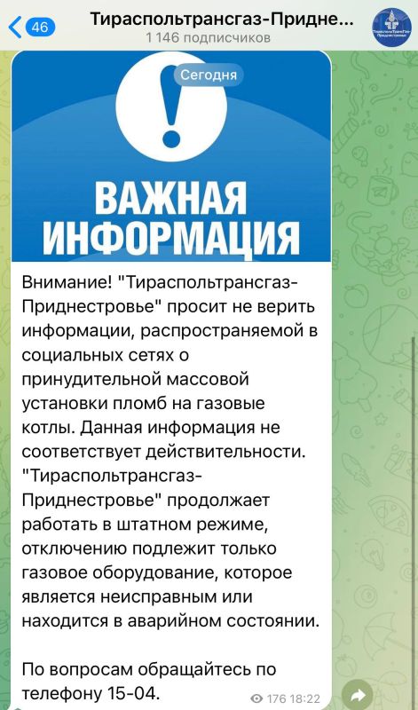 «Тираспольтрансгаз» выступил с опровержением слухов из соцсетей, что идет установка пломб на газовые котлы. Пишут, что это ложь, пендеж и провокация. // ТСВ Приднестровье