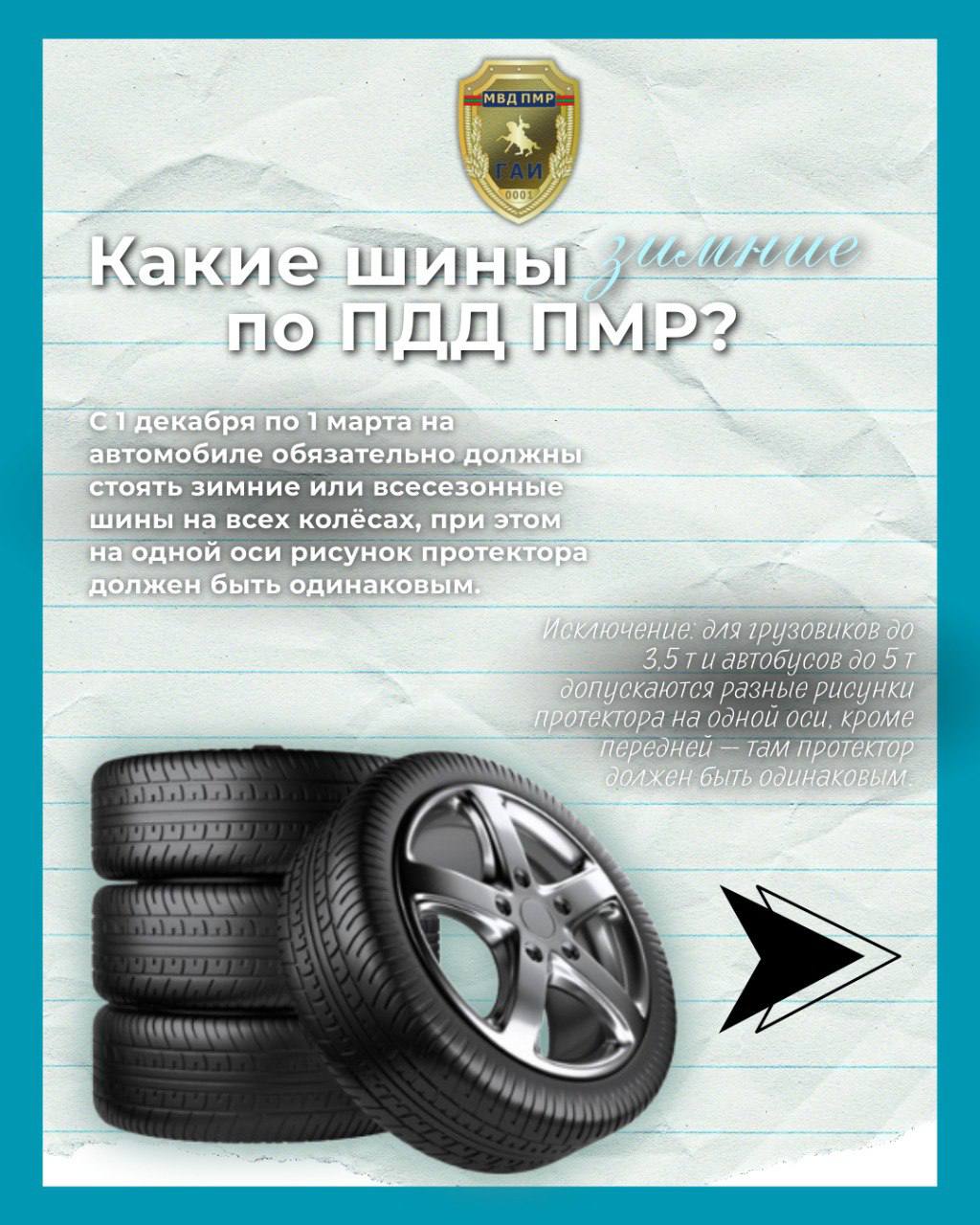 С 1 декабря по 1 марта все колёса автомобиля должны быть оснащены зимними или всесезонными шинами. Рисунок протектора на одной оси должен быть одинаковым. Исключение предусмотрено для грузовых авто до 3,5 тонн и автобусов до 5 тонн.