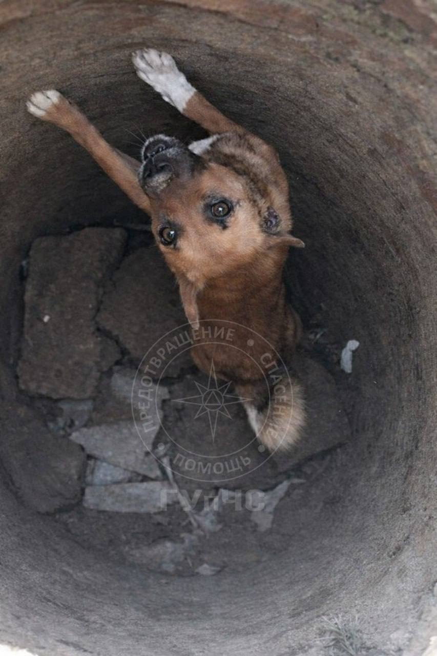 ) рыжая собачка упала в колодец на заброшенной территории. Жители соседних домов услышали лай и вызвали спасателей.