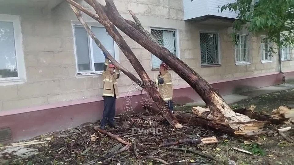 Вчера он упал на пятиэтажку, повредил два кондиционера, два окна и задел балкон.Сотрудники АСП оперативно распилили и убрали дерево.© Пресс-служба ГУпЧС МВД ПМР