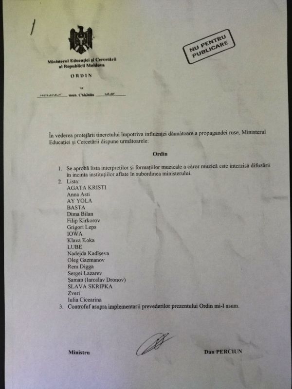 В сеть утек список российских музыкантов, которых запретили включать на молдавских школьных дискотеках. Среди них Баста, Кадышева, Шаман, группа AY YOLA и почему-то исполнитель песни «Сидим с бобром за столом» Слава Скрипка. Запрет исполнителей объясняется «вредным для молодежи влиянием российской пропаганды».