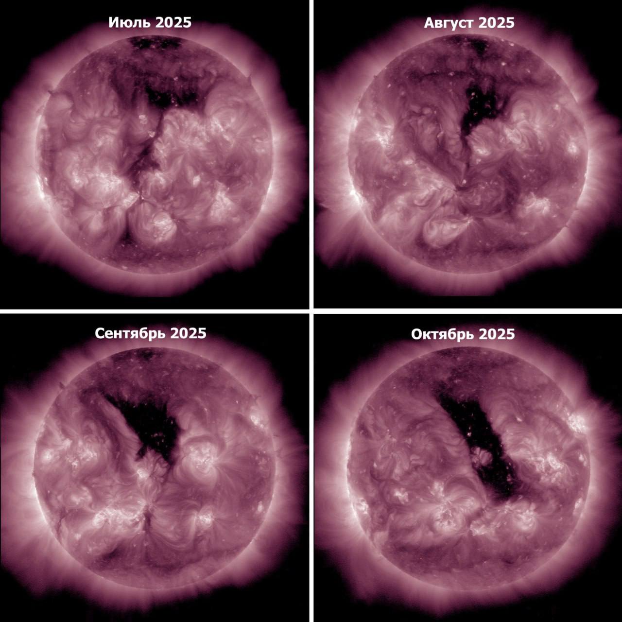 Одна из среднего размера корональных дыр, существующая уже несколько месяцев на Солнце, значительно выросла за последний месяц и, судя по всему, всё же усложнит геомагнитную обстановку.