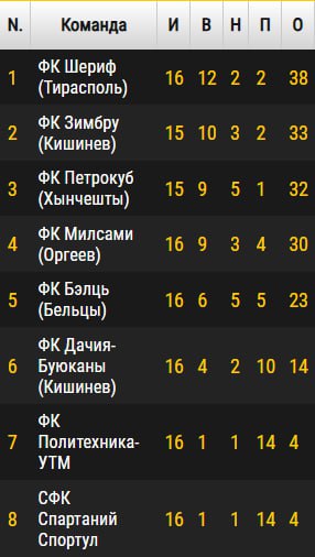 «Шериф» продолжает удерживать лидерство в молдавском первенстве по футболу: после 16 туров у него 38 очков.