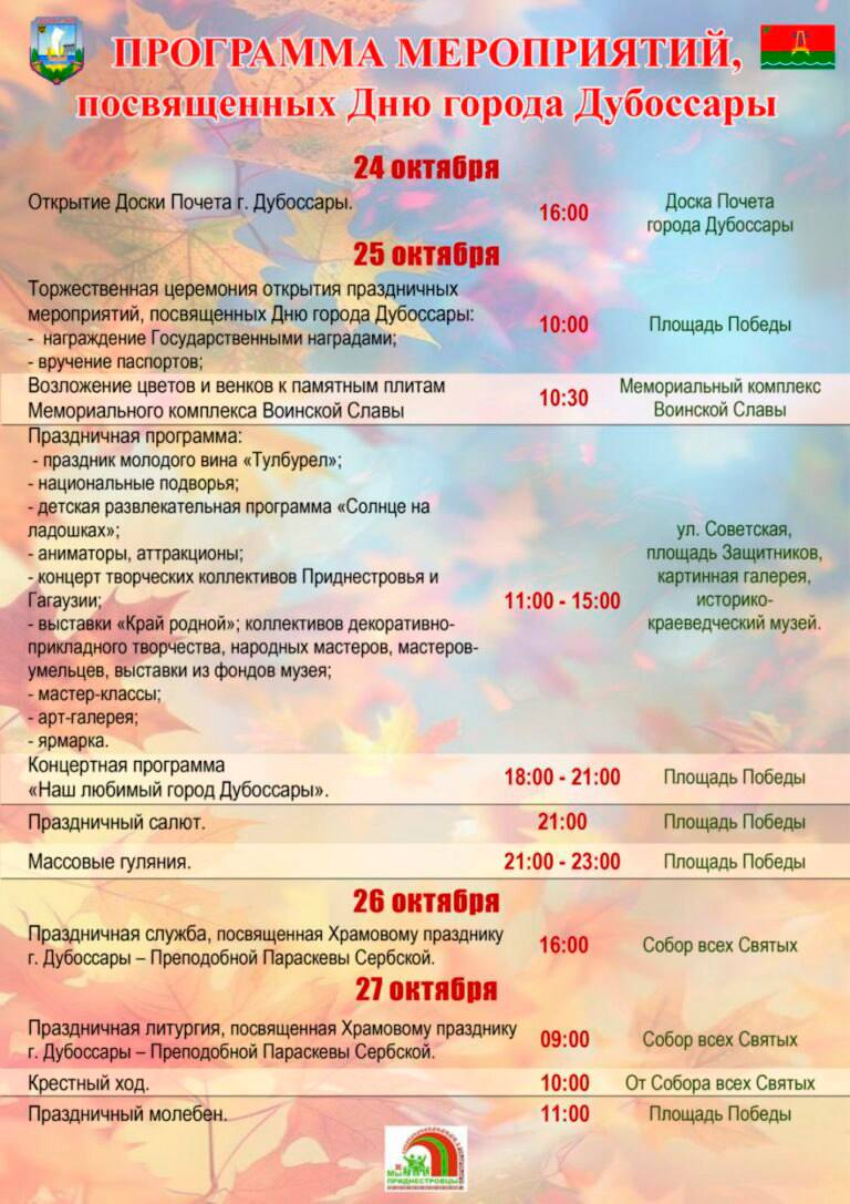Дубоссары — старт в 10:00. Праздник молодого вина «Тулбурел», национальные подворья, концерты, аттракционы, мастер-классы и тоже красочный салют.