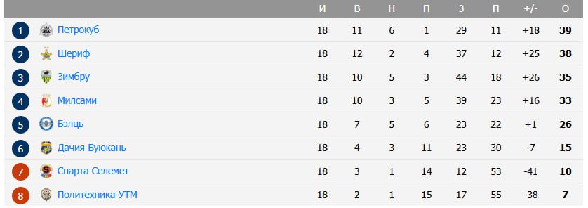 В результате у «Петрокуба» после 18 туров 39 очков, у «Шерифа» – 38, у кишиневского «Зимбру» – 35.