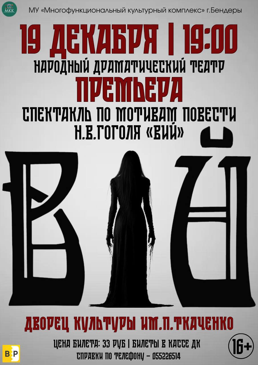 19 декабря в 19:00 на сцене Дворца культуры им. П. Ткаченко — народный драматический театр представит спектакль по мотивам мистической повести Н.В. Гоголя «Вий».