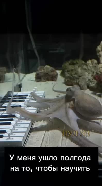 «У меня ушло полгода на то, чтобы научить моего осьминога играть на пианино. Я спас его на рыбном рынке в Южной Корее. Вместо того, чтобы бросить его на сковородку, я бросил его в свой аквариум. Ему потребовалось несколько дней, чтобы довериться мне настолько, чтобы есть то, что я ему давал.