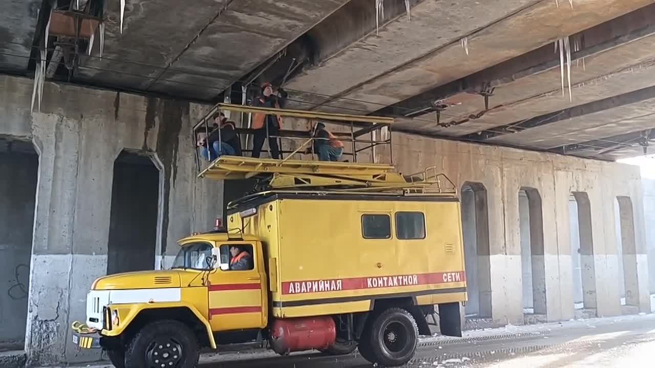 Коммунальщики сбивают сосульки, чтобы наледь не упала на проезжающие под мостом авто.