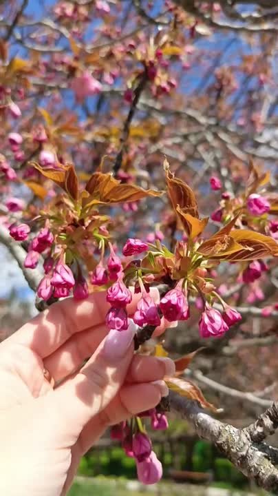 А вот соседняя сакура с цветением запаздывает уже второй год, хотя раньше оба дерева цвели одновременно. Зато делать селфи у сакуры можно будет минимум до середины мая: когда начнёт осыпаться первая, вторая вся будет в розовых цветах.