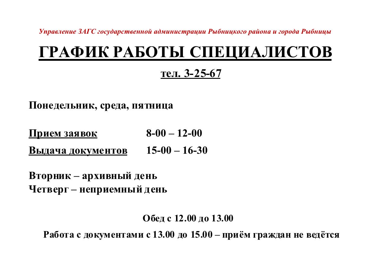 Государственная администрации Рыбницкого района и г.Рыбница сообщает, что график работы Управления ЗАГС изменён и утверждён в новой редакции.
