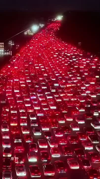 В сети вирусится видео, где машины слились в одну большую красную реку, когда китайцы возвращались домой после «Золотой недели» — 8-дневных каникул