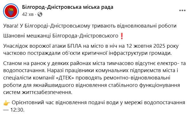 В результате ударов дронами в Белгород-Днестровском Одесской области частично отсутствует электричество.