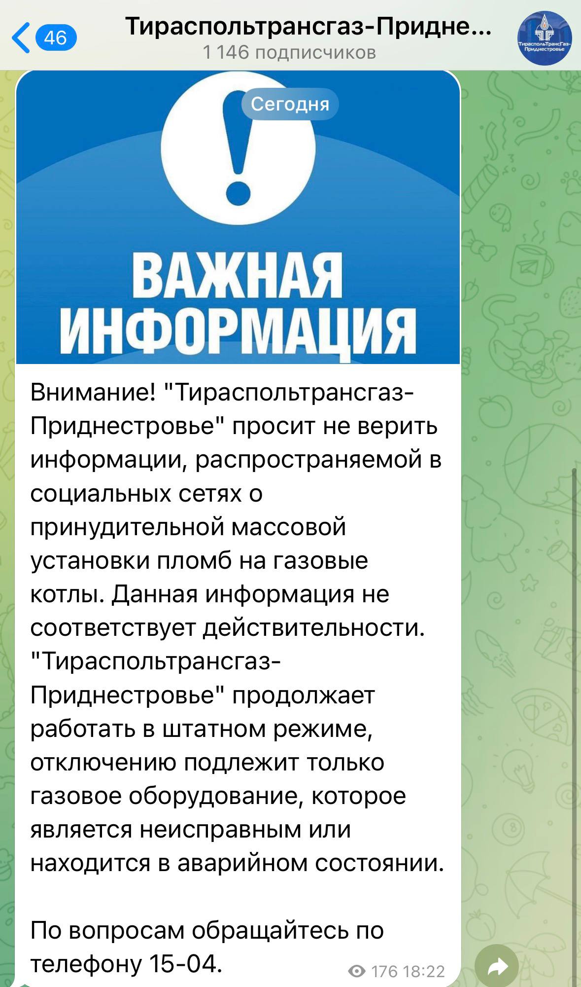 «Тираспольтрансгаз» назвал фейком информацию о принудительной установке пломб на газовые котлы.