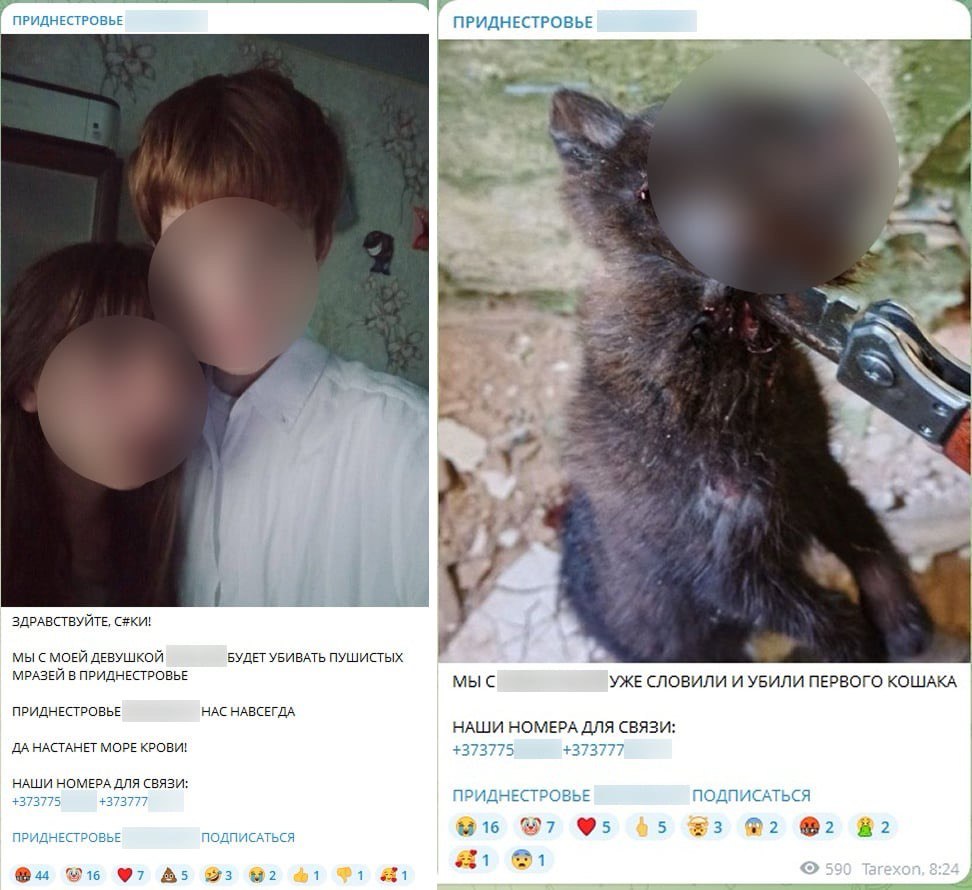 Подросток из Тирасполя поругался в украинском телеграм-паблике с местными подписчиками. Те ему отомстили: создали фейковую группу от его имени и публикуют в нём трэш-контент – издевательства над домашними животными. Разместили в паблике персональную информацию школьника из Тирасполя, личное фото взяли из соцсетей и нашли номера телефонов. Из интернета взяли фото и видео с убийствами котят, якобы совершенные юношей и его девушкой. Теперь на парня посыпались угрозы от зоозащитников. Школьник надеется, что после нескольких жалоб в администрацию мессенджера телеграм-канал удастся заблокировать.