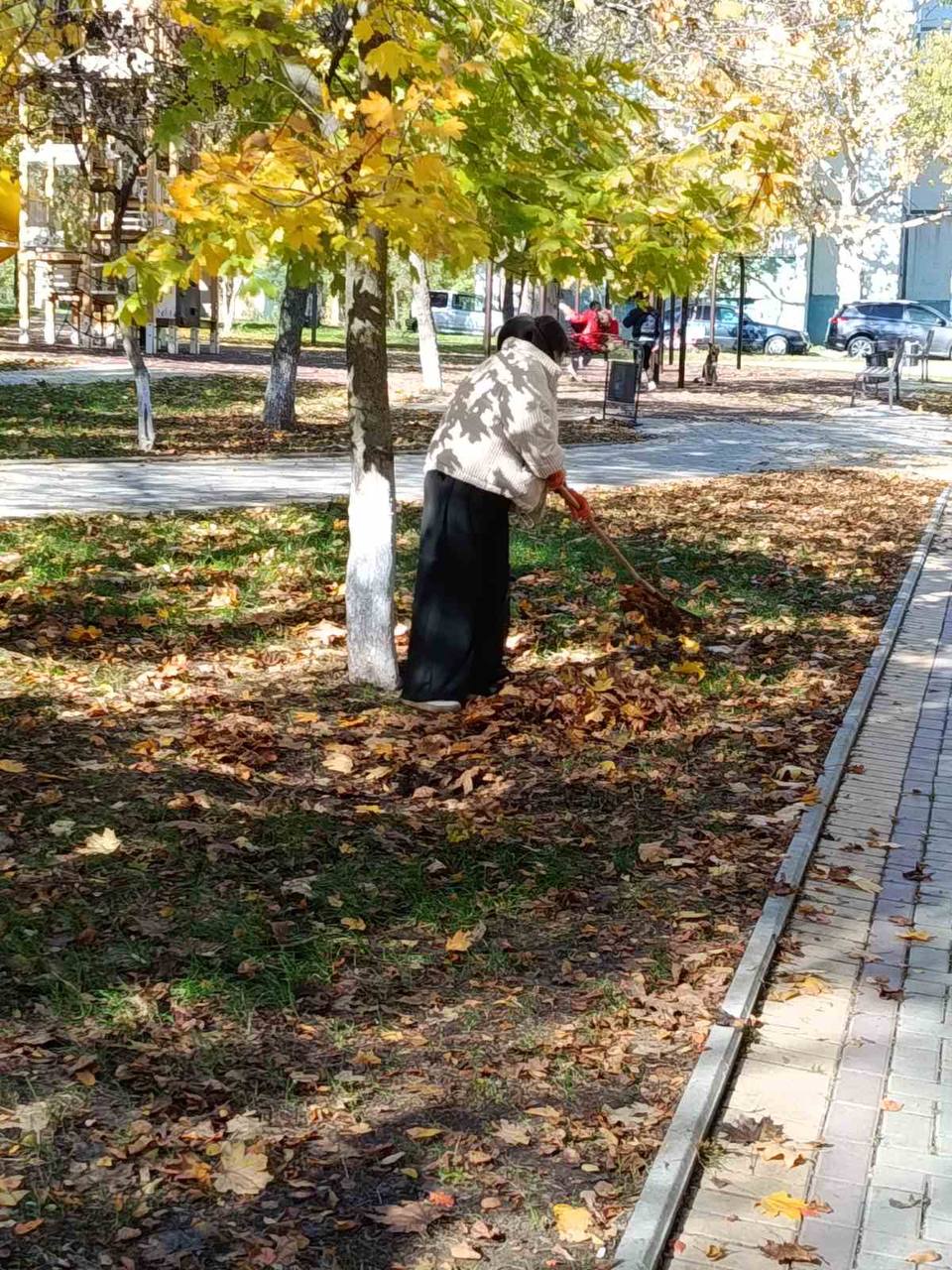 Ученики школы активно убирали опавшую листву на территории учебного заведения, показывая заботу о чистоте и природе вокруг.