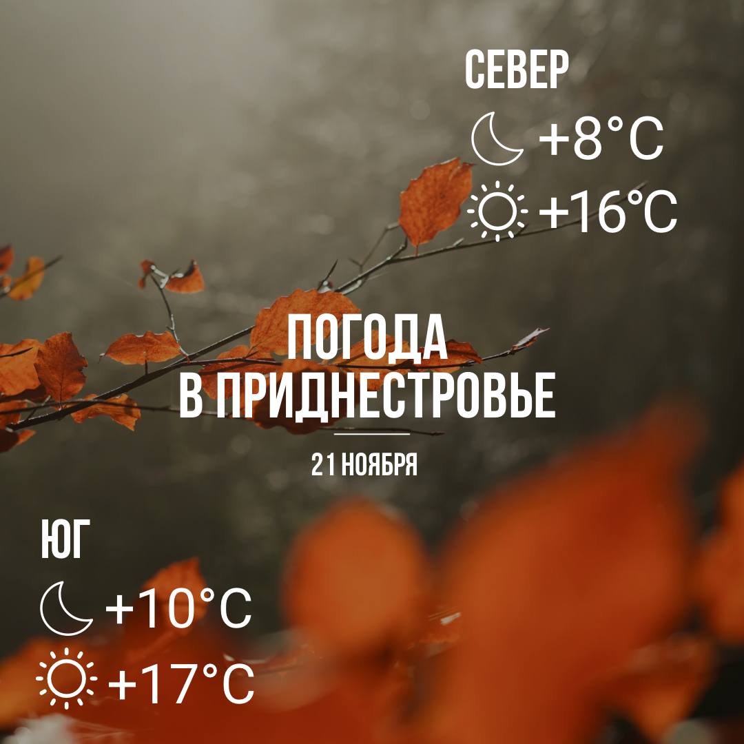 Доброго утра!Прогноз погоды на сегодня, 21 ноября. Ожидается облачная погода с прояснениями.Утром местами кратковременный дождь, местами туман.Ветер юго-восточный, 5-8 м/с.Температура воздуха днем по северу +14...+16°С...