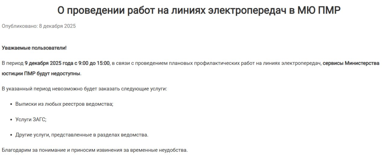 Завтра, с 9:00 до 15:00, сервисы Минюста ПМР будут недоступны из-за профилактики на линиях электропередач