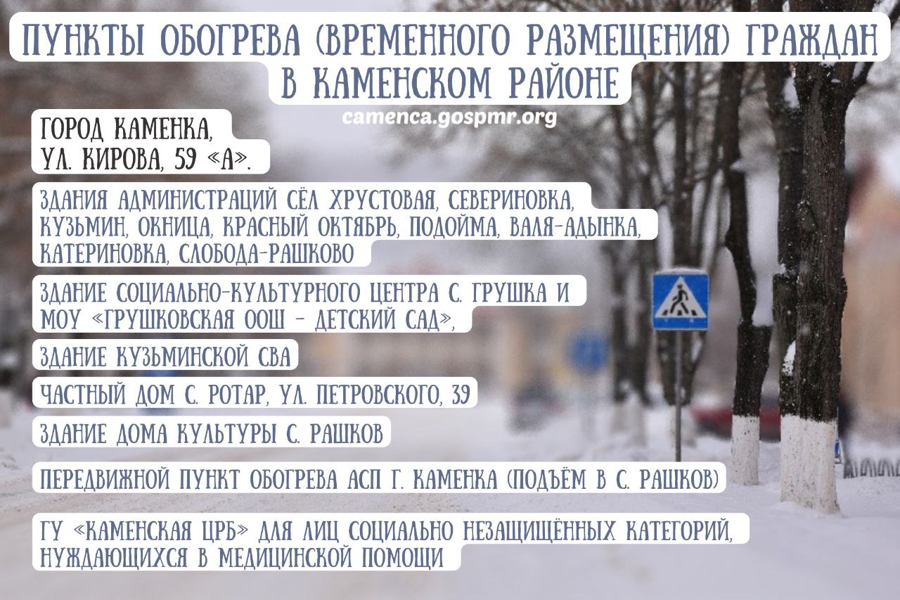 Информируем жителей Каменского района о том, что в районе функционируют пункты обогрева и временного размещения граждан.