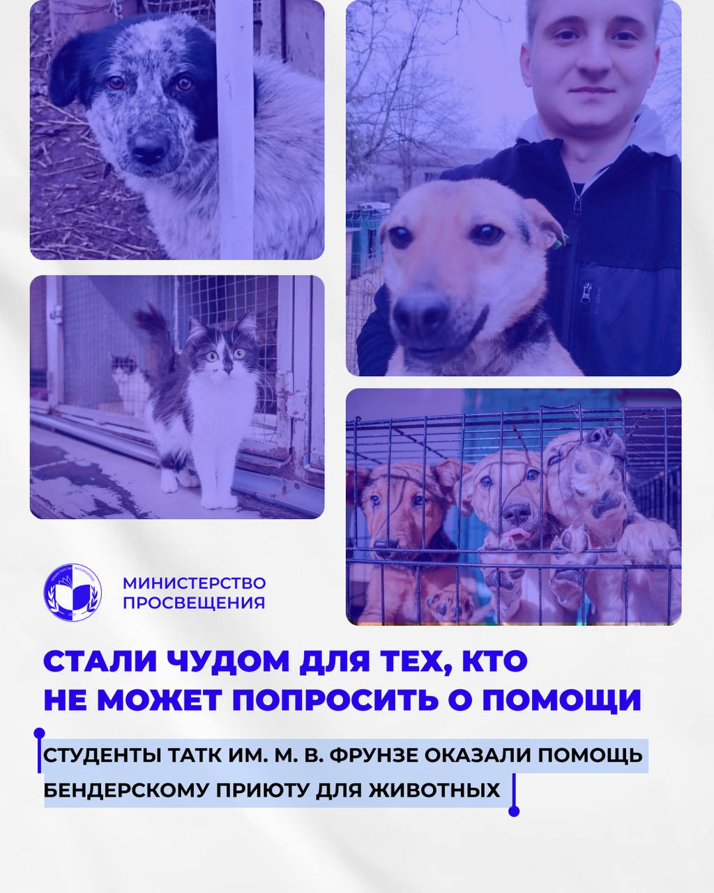 Волонтёры Тираспольского аграрно-технического колледжа им. М. В. Фрунзе посетили Бендерский приют для животных. Студенты передали тёплые одеяла и пледы, корма, крупы, лекарства и бытовую химию — всё для комфортной зимовки питомцев.