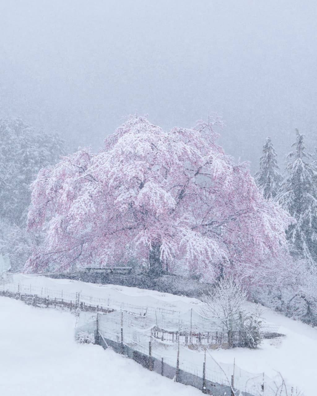 Сакура в снегу - в Японии считается редким и особенно красивым явлением.