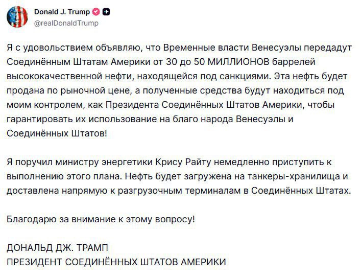 Временные власти Венесуэлы передадут США от 30 до 50 млн баррелей высококачественной нефти, — Трамп.