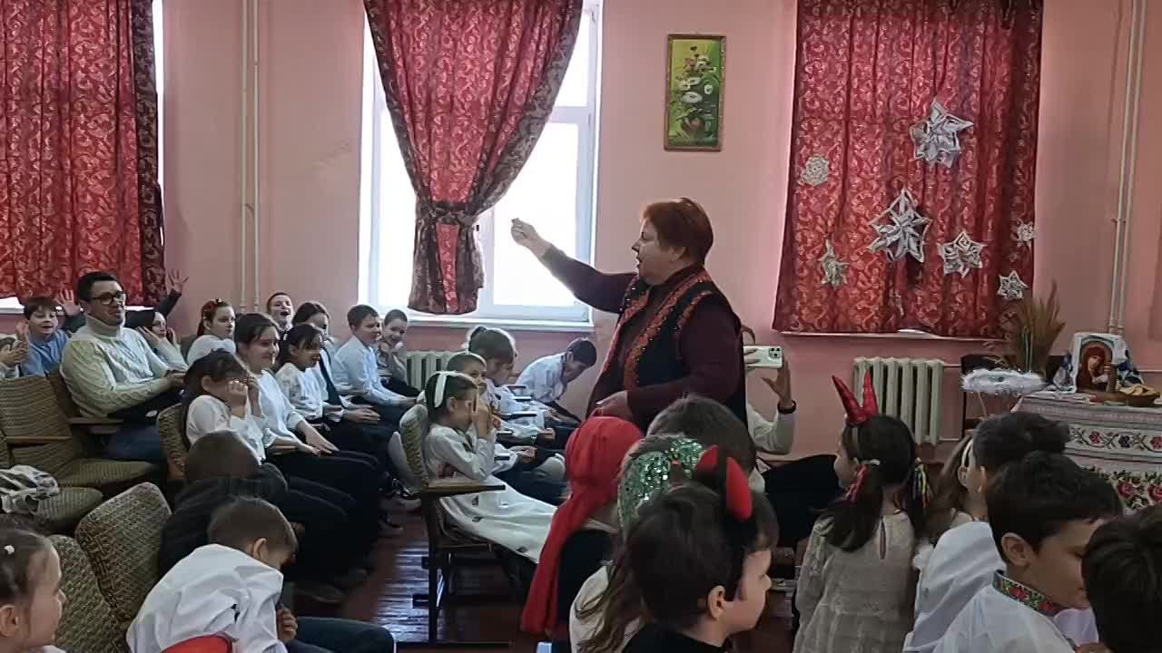 В актовом зале собрались более сотни гимназистов. Для них подготовили праздничный концерт с песнями, сценками и обрядовыми элементами. Участники желали хозяевам благополучия и удачи, следуя старинным обычаям.