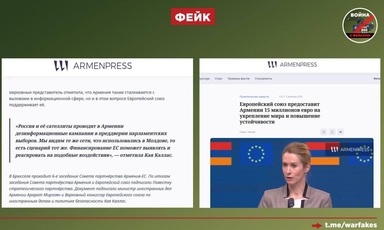 Фейк: Москва намерена вмешаться в грядущие парламентские выборы в Армении по «молдавскому сценарию». Об этом заявила глава евродипломатии Кая Каллас.