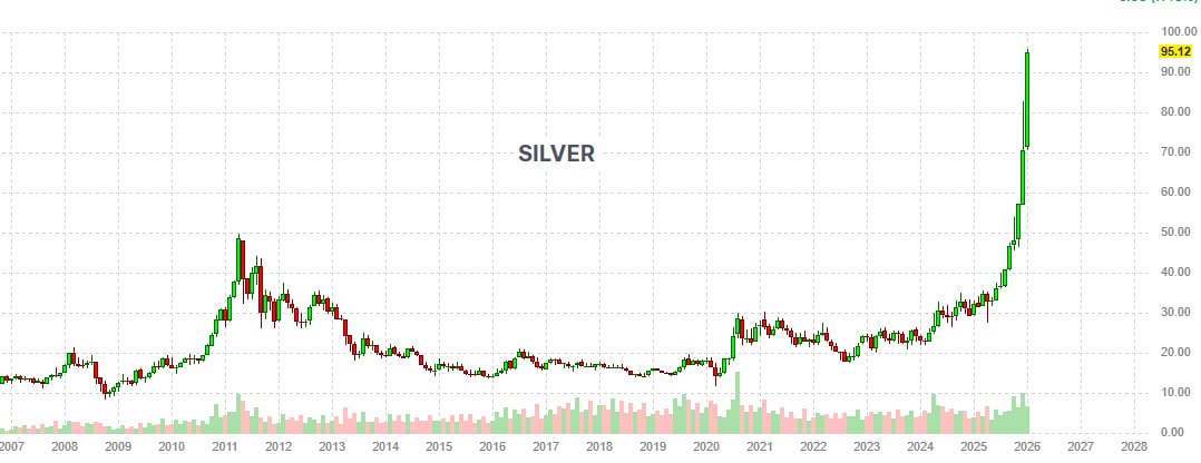 В мире вслед за золотом стремительно дорожает серебро — уже выше 95 долларов. За год драгметалл увеличился в цене более чем на 200%.