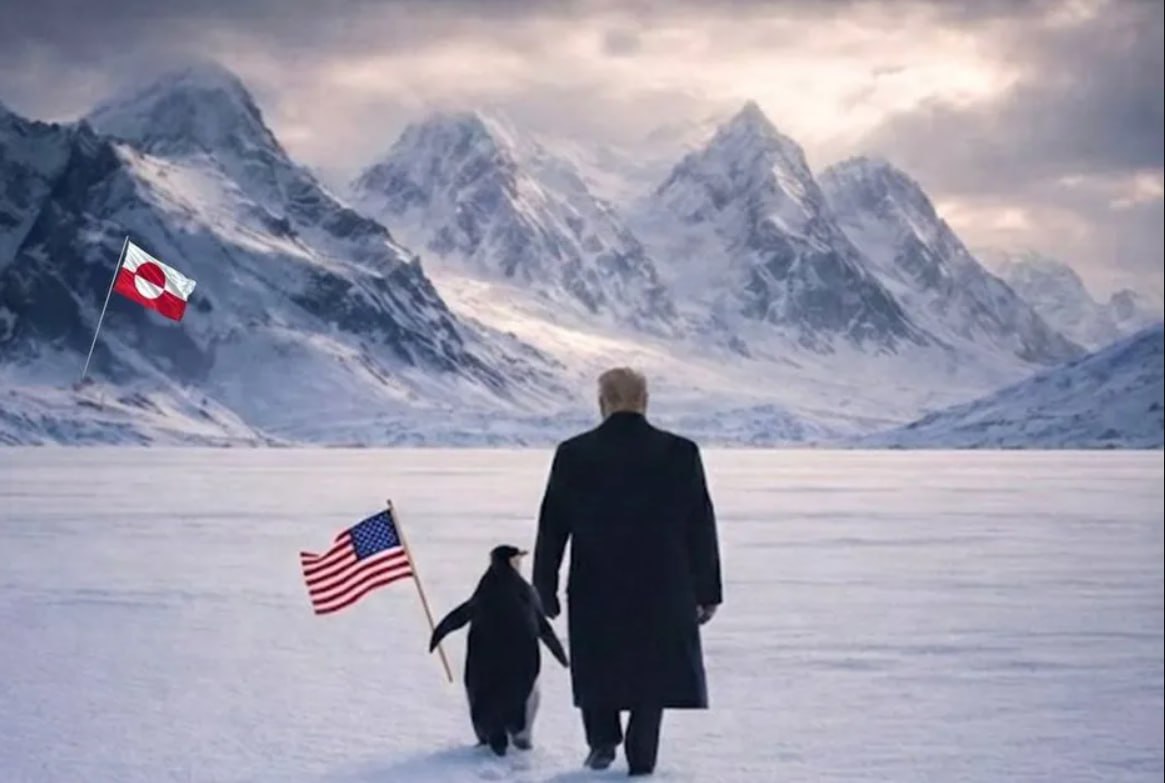 Белый дом опубликовал ИИ-фото президента США, разгуливающего по Гренландии под руку с пингвином (хоть пингвины в Гренландии и не водятся).