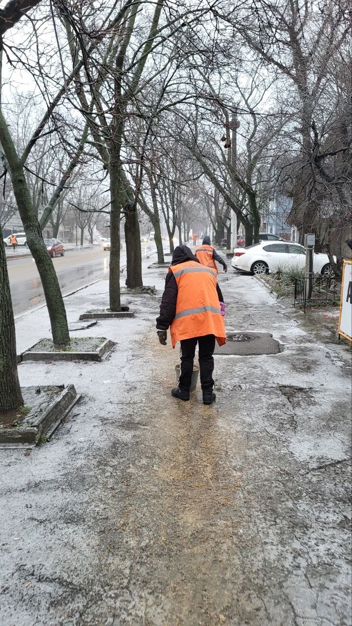 Коммунальщики трудятся нон-стоп. Люди в оранжевых жилетах с вёдрами песка работают без остановки, чтобы мы могли безопасно пройти по льду.