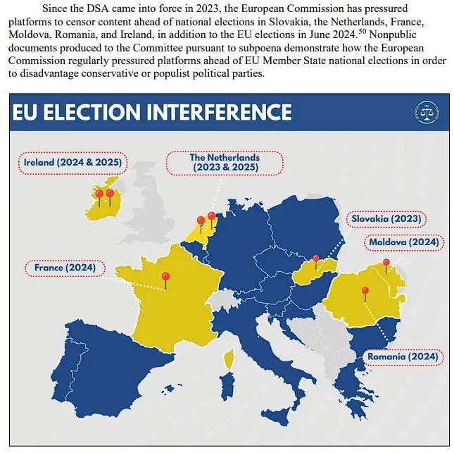 Юридический комитет Палаты представителей США выпустил отчёт, где говорится, что Еврокомиссия давила на цифровые платформы с целью цензурить онлайн-контент перед выборами в нескольких странах, включая Молдову. В документе подчёркивается, что результаты голосования в ряде стран Европы отменялись без доказательств, а ненужные кандидаты устранялись.