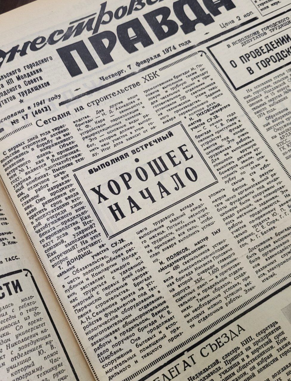 Наша «машина времени» отправляется в 7 февраля 1974 года. Листая пожелтевшие страницы «Днестровской правды», мы переносимся на одну из самых масштабных строек того времени — хлопчатобумажный комбинат (ХБК).