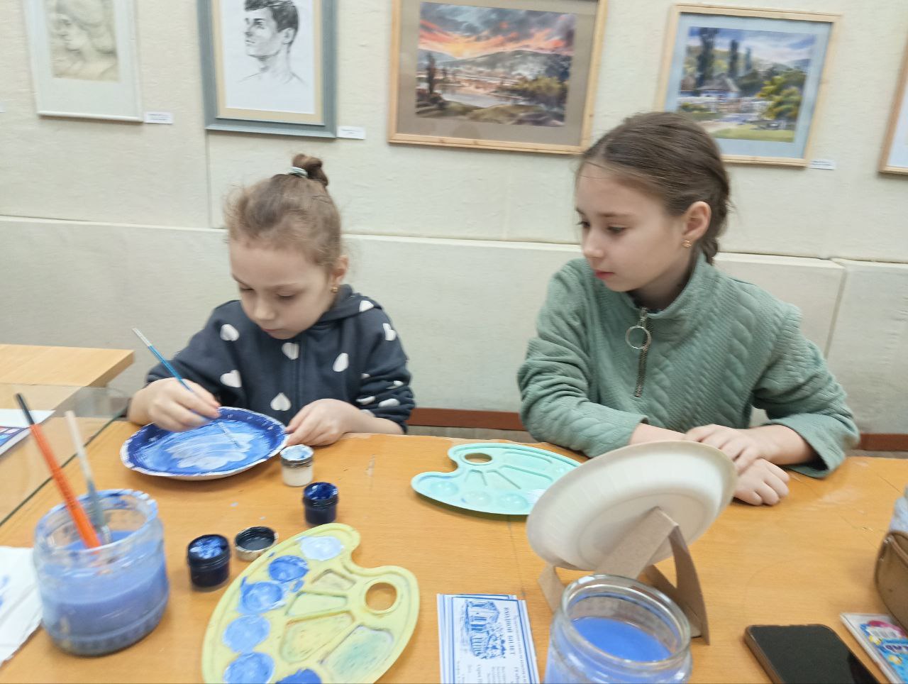 На занятиях в художественном музее ребята осваивали технику гжель: сначала знакомились с экспонатами из музейных фондов, а потом создавали свои собственные бело-синие шедевры.