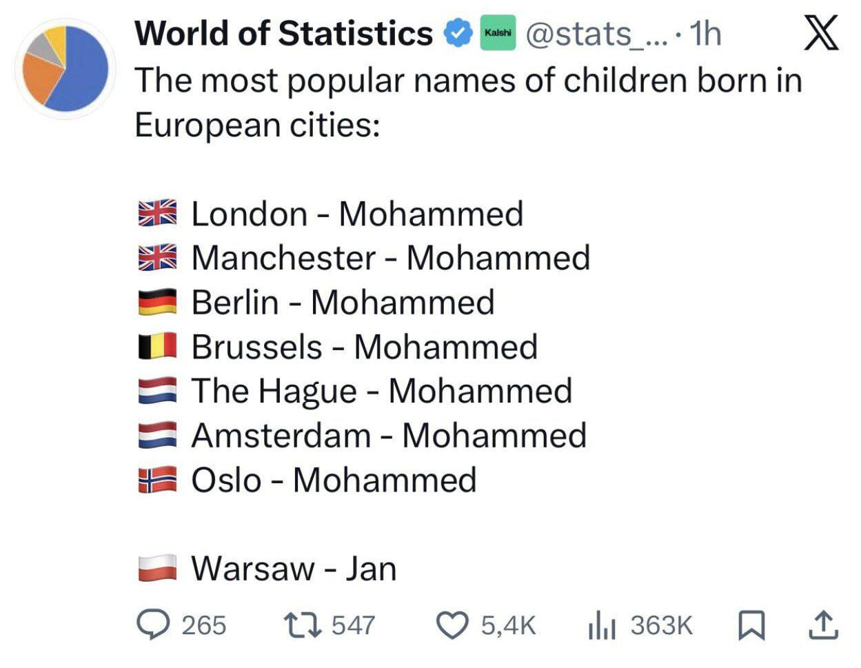 Имя Мухаммед стало самым популярным среди новорождённых в Европе.