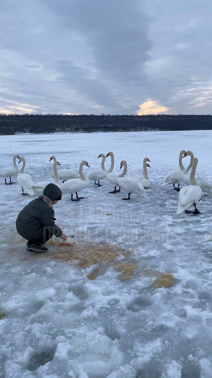 На Дубоссарском водохранилище поселились лебеди. Жители подкармливают их кукурузой.