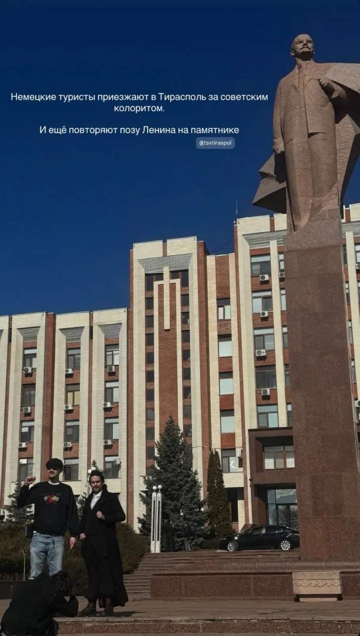 Немецкие туристы приехали в Тирасполь за советским колоритом и повторяют для фотографии позу Ленина на памятнике