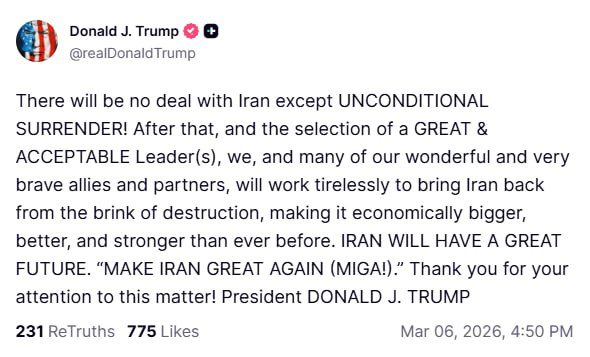 Никакой сделки с Ираном не будет, кроме БЕЗОГОВОРОЧНОЙ КАПИТУЛЯЦИИ! После этого, и после избрания ВЕЛИКОГО И ПРИЕМЛЕМОГО лидера (лидеров), мы и многие наши замечательные и очень смелые союзники и партнеры будем неустанно работать над тем, чтобы вывести Иран из состояния, близкого к разрушению, сделав его экономически более крупным, лучшим и сильным, чем когда-либо прежде. У ИРАНА БУДЕТ ВЕЛИКОЕ БУДУЩЕЕ. «СДЕЛАЕМ ИРАН СНОВА ВЕЛИКИМ (MIGA!)».