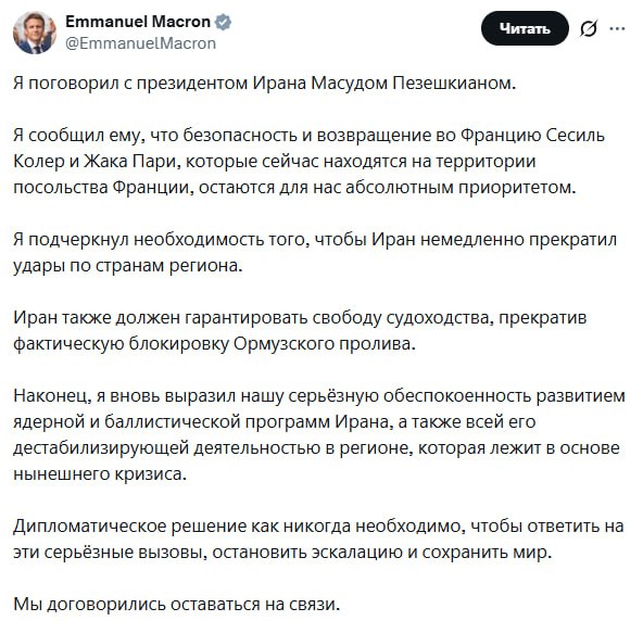 Президент Франции заявил, что провел телефонный разговор с президентом Ирана Пезешкианом.