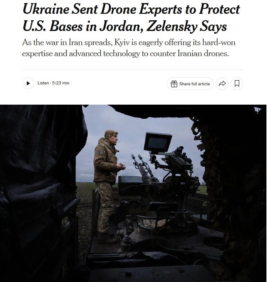 Украина отправила экспертов по дронам защищать базы США на Ближнем Востоке, — The New York Times.