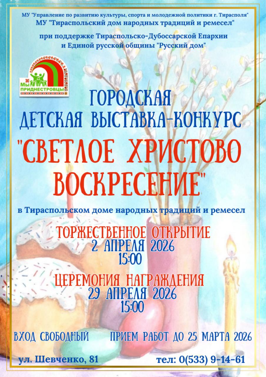 В преддверии светлого праздника Пасха Тираспольский дом народных традиций и ремёсел приглашает ребят от 7 до 17 лет принять участие в яркой выставке-конкурсе