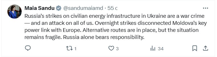 Удары России по гражданской энергетической инфраструктуре Украины — это военное преступление и нападение на всех нас. Ночные удары нарушили ключевое энергетическое сообщение Молдовы с Европой. Альтернативные пути существуют, но ситуация остается нестабильной. Ответственность несет только Россия,