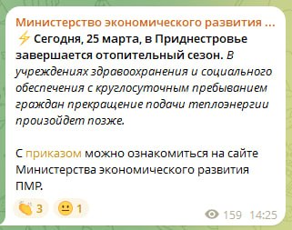 В учреждениях здравоохранения и социального обеспечения с круглосуточным пребыванием граждан прекращение подачи теплоэнергии произойдет позже.@merpmr28 марта Тирасполь выходит на общереспубликанский субботникЭто замечательный повод навести порядок...