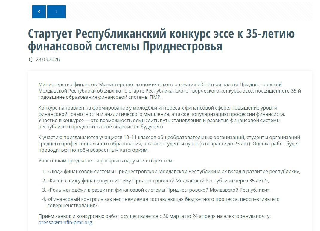 Отправить заявку нужно до 24 апреля на почту – pressa@minfin-pmr.org . Подробности – на сайте Минфина.