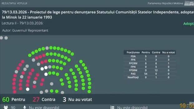 Депутаты одобрили денонсацию базового соглашения о создании СНГ и его устава. «За» проголосовали 60 депутатов, 27 – против, трое воздержались. При этом Кишинёв планирует сохранить отдельные «выгодные» соглашения, пишут молдавские СМИ.