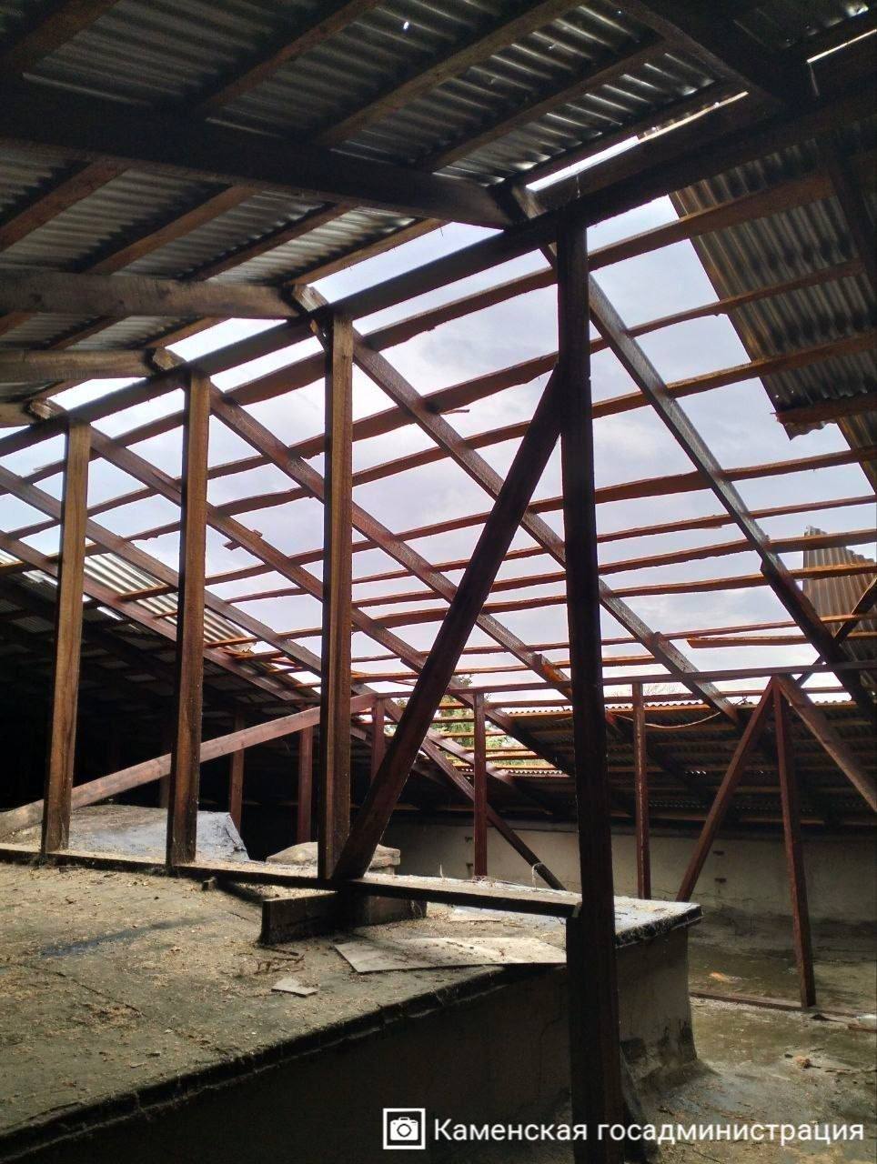 На фото — последствия непогоды в Каменке: повреждённая крыша главного корпуса политехнического техникума и упавшее дерево на территории водоканала.