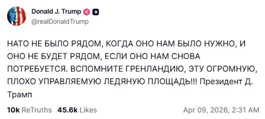 НАТО НЕ БЫЛО РЯДОМ, КОГДА ОНО НАМ БЫЛО НУЖНО, И ОНО НЕ БУДЕТ РЯДОМ, ЕСЛИ ОНО НАМ СНОВА ПОТРЕБУЕТСЯ. ВСПОМНИТЕ ГРЕНЛАНДИЮ, ЭТУ ОГРОМНУЮ, ПЛОХО УПРАВЛЯЕМУЮ ЛЕДЯНУЮ ПЛОЩАДЬ!!! Президент Д. Трамп