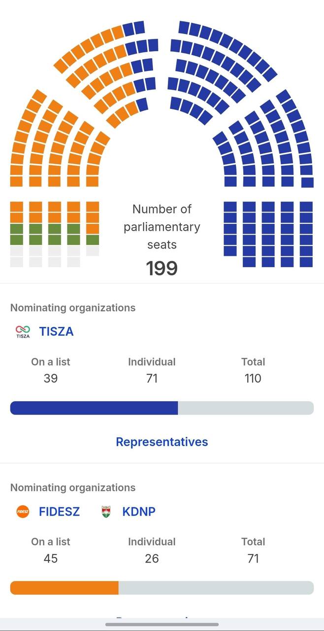 Первые результаты идут из Венгрии, где большинство поддерживает оппозицию, а значит точные результаты будут ближе к утру. Орбан пока проигрывает выборы, а партия Тиса набирает большинство, при этом в Будапеште уже выходят сторонники оппозиции, чтобы занять улицу и контролировать результаты голосования.