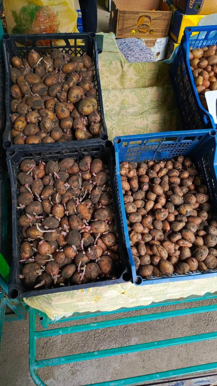 Картошку на посадку продают по 8-10 рублей за кило, это с росточками размером с куриное яйцо. Помельче отдают за 6 рублей. Мы нашли сорта славянка, ирга и ривьера. Продавцы говорят, что из-за праздников картошку на посадку берут не так активно, как пару недель назад.