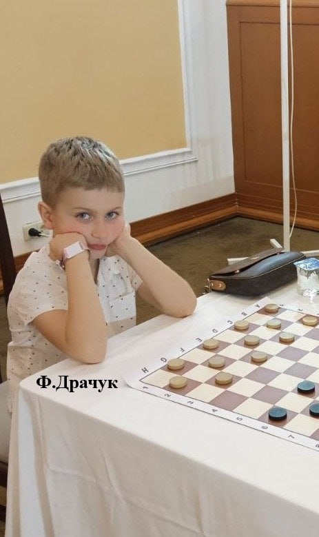 На фото – Филипп Драчук из Тирасполя. Ещё не пошёл в школу, а уже выиграл бронзу молодёжного Чемпионата Европы по шашкам-64. Отличился в блице в группе до 9 лет.